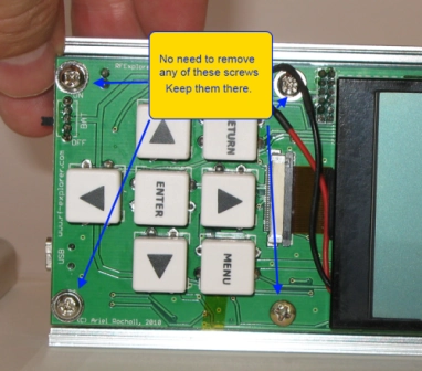 You can now safely remove the RF Explorer front cover, so you will get now the buttons, LCD and PCB visible. Do not remove any of the screws from the PCB. Below is an image of a potential layout of the PCB screws, but your model may differ slightly from this.
